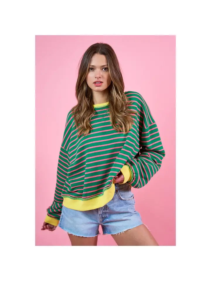 Traditional knit rib on neck / sleeve hem / bottom opening hem Contrast thread A stylish and cozy sweatshirt is crafted from luxurious French Terry fabric. The standout feature is the contrast color block detailing, which adds a modern twist to the classic striped design. Shell: 50% cotton 50% polyester Contrast: 95% cotton 5% spandex